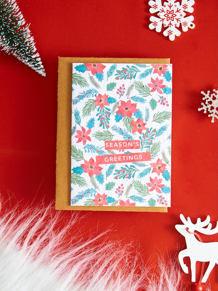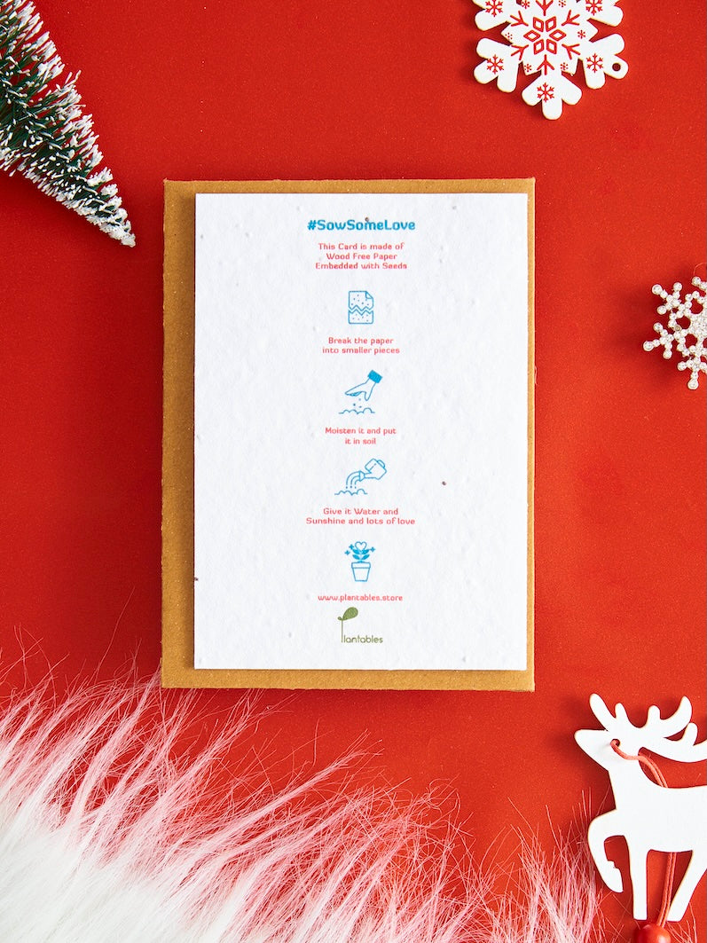 Bright red poinsettias and mistletoes bring out the holiday cheer in full gusto. A heartfelt season’s greeting card for your loved ones cuz ‘tis the season to  #SowSomeLove! Our Plantable greetings are made from 100% upcycled cotton scrap paper with seeds embedded in them.